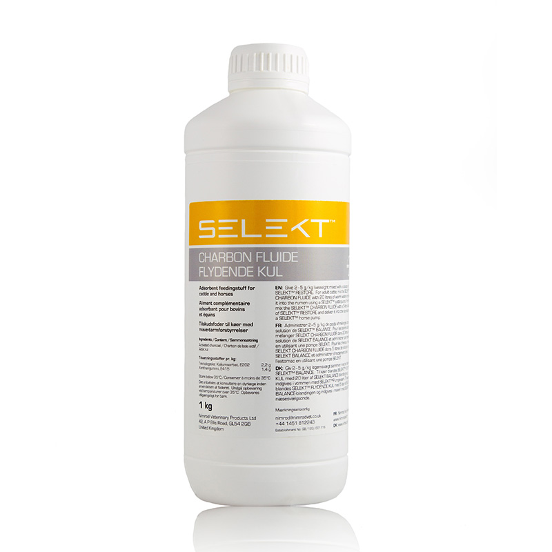 Gebruik 3,5 ml per kg lichaamsgewicht (±1 g actieve kool/kg), eventueel gemengd met een oplossing van Selekt Restore. Meng de vereiste hoeveelheid met 20 liter warm water en breng in met een drenchpomp. Dosis kan in overleg met de dierenarts herhaald worden indien nodig.